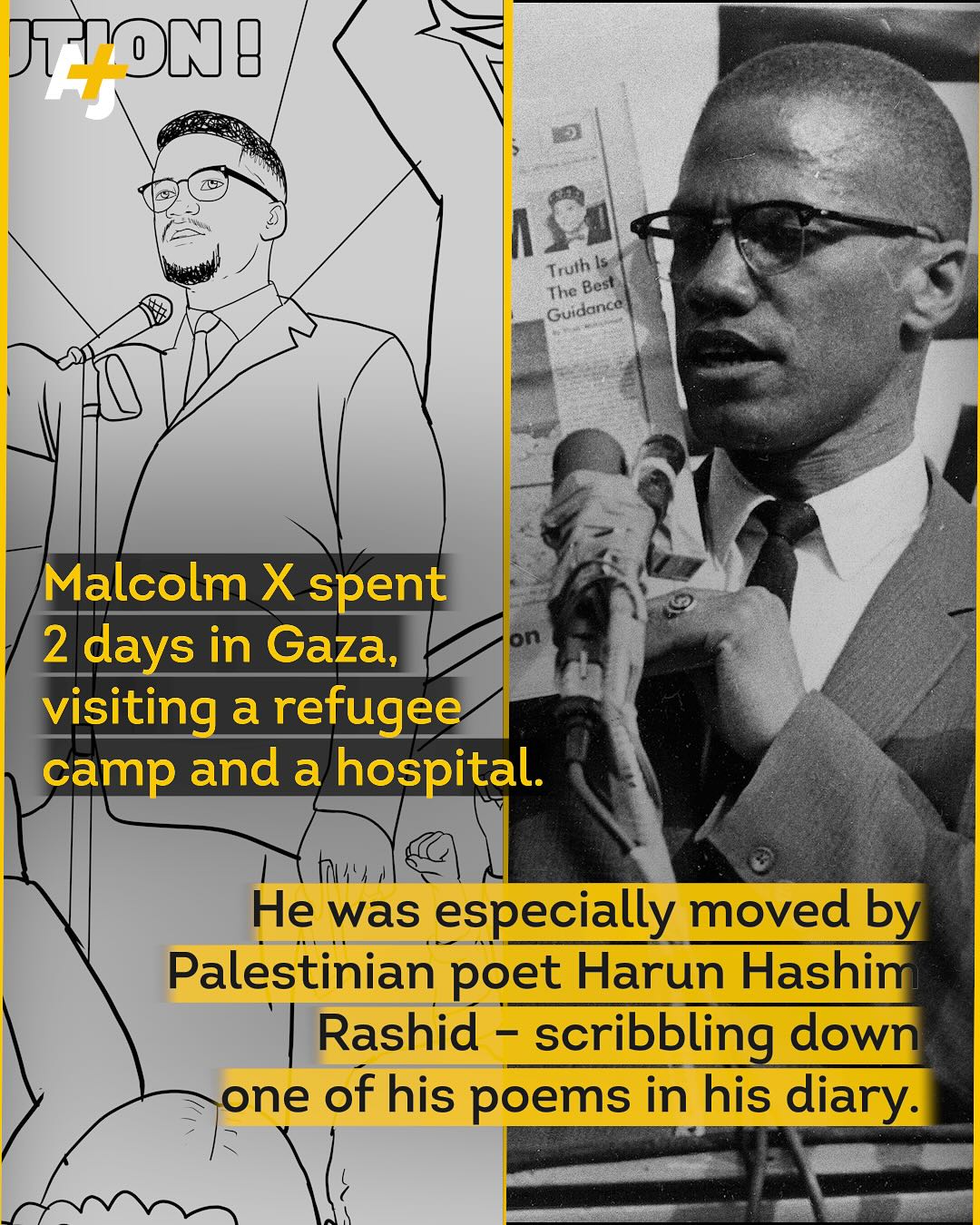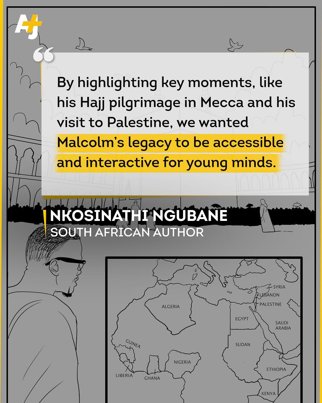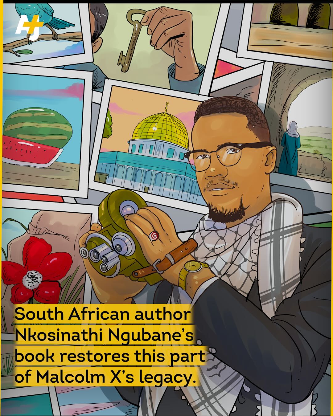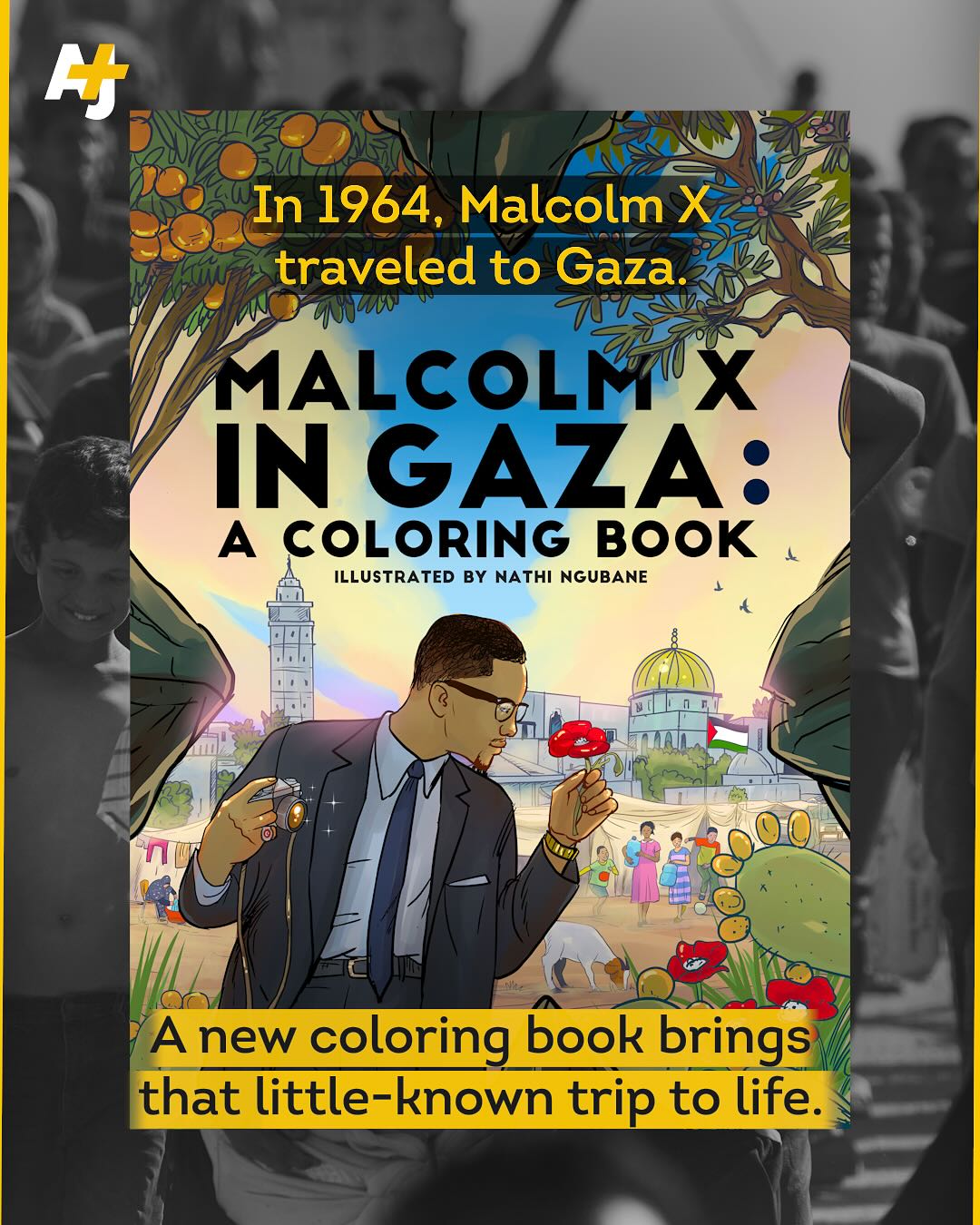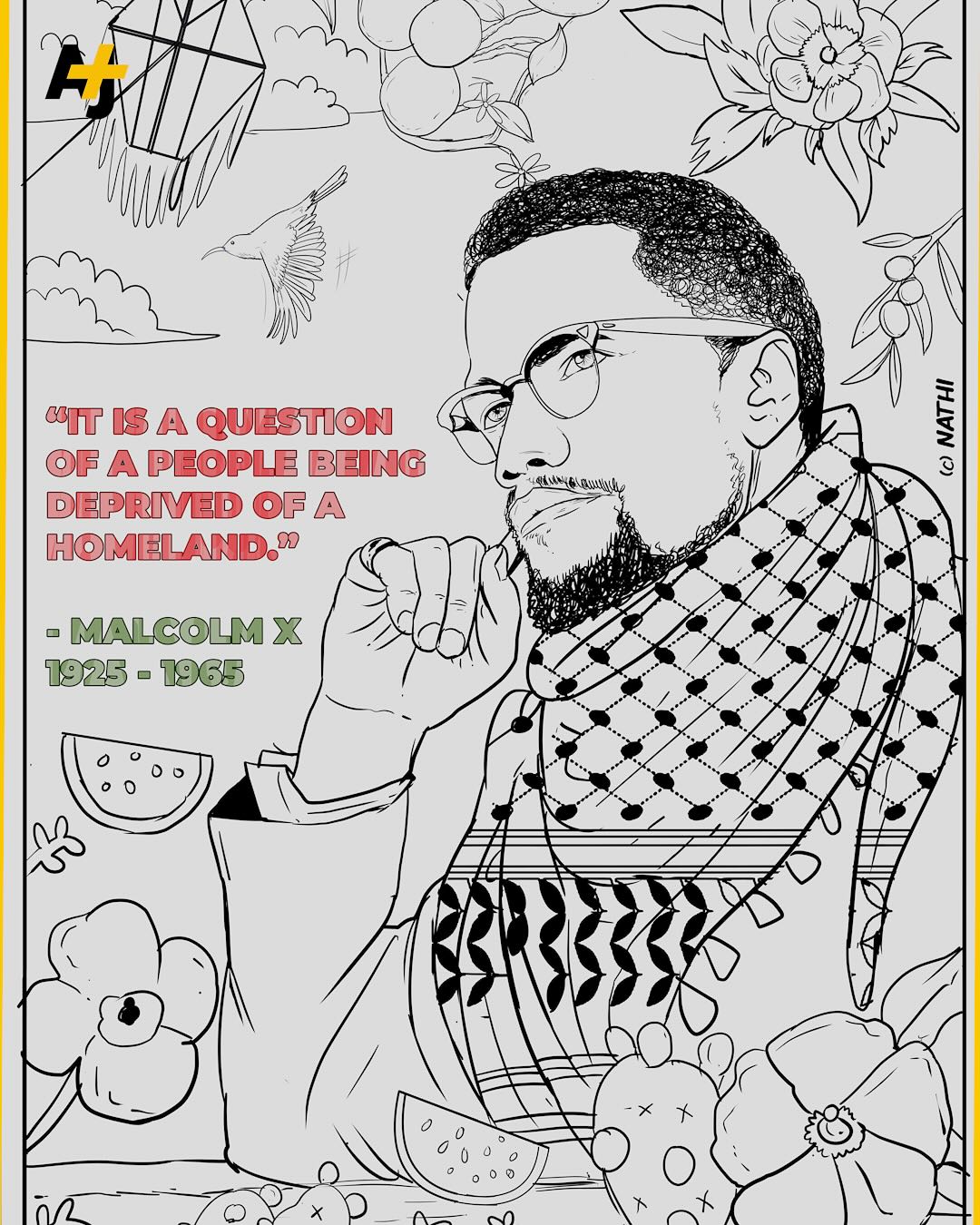 Malcolm X in Gaza is an educational coloring book that provides a gateway into the revolutionary leader’s little known visit to Gaza in 1964. In a series of stunning illustrations, Soweto-based Nathi Ngubane traces Malcolm’s travels across Africa and the Middle East, as well as his historic two-day visit in Gaza, during which he visited refugee camps, toured the mosques and the markets, and listened to the stories of Palestinians who had been displaced by the Nakba.